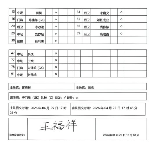 本场比赛的首发名单出炉